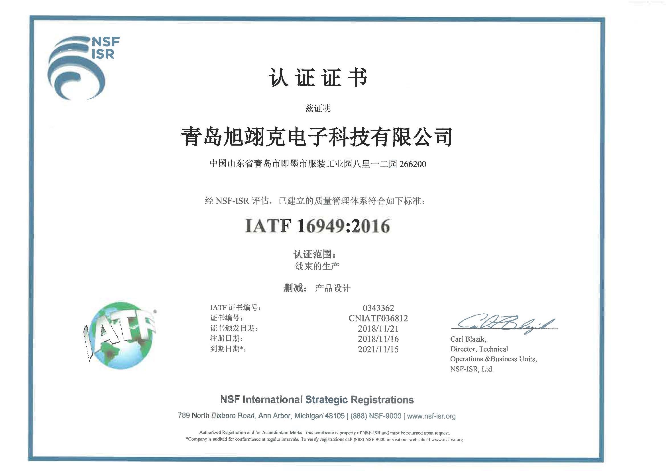 旭翊克通過(guò)美國(guó)UL線(xiàn)束工廠(chǎng)認(rèn)證(認(rèn)證號(hào)碼:E508227) ; 通過(guò)IATF/TS 16949:2016認(rèn)證,產(chǎn)品完全符合ROHS及REACH環(huán)保要求。